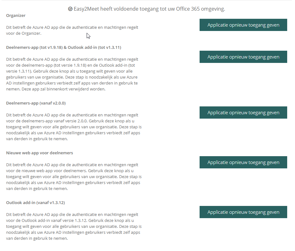 Voor de juiste werking van de diverse (legacy) apps is het nodig om verschillende applicaties toegang te geven vanuit Indeqa. Dit kan een Global Administrator doen door naar een organizer van een willekeurige Indeqa installatie te gaan. Daar is via het tandwiel (links onderin) het menu Azure AD te vinden waar de 5 machtigingen staan opgesomd. Is een machtiging niet gegeven dan is de button geel. Is de machtiging er wel dan is de button groen van kleur.